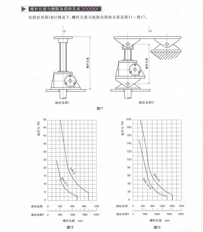 圖下給出了允許彎曲力矩下,絲桿長(zhǎng)度與極限負(fù)荷的關(guān)系,根據(jù)絲桿行程和起升負(fù)荷,查出所需升降機(jī)的型號(hào)。